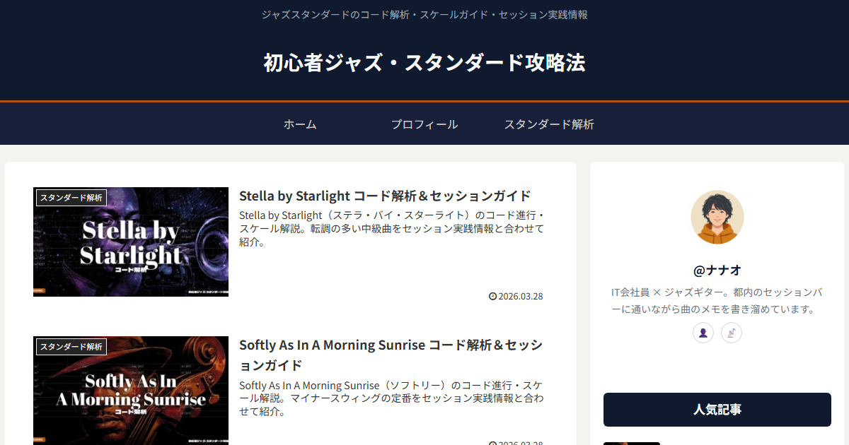 そんな自分のために、スタンダード曲のコード進行やスケールを1曲ずつ整理したメモを作り始めました。どうせ作るなら同じように困っている人にも見てもらえるようにと、サイトにまとめたのがこのブログです。